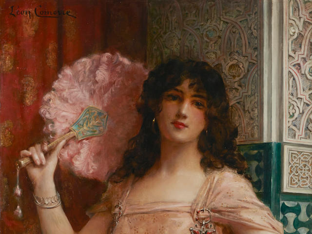 Another masterpiece in the Orientalist theme is an exotic portrait of a harem beauty holding a pink fan by famed artist Leon Francois Comerre (est. $150,000-200,000):