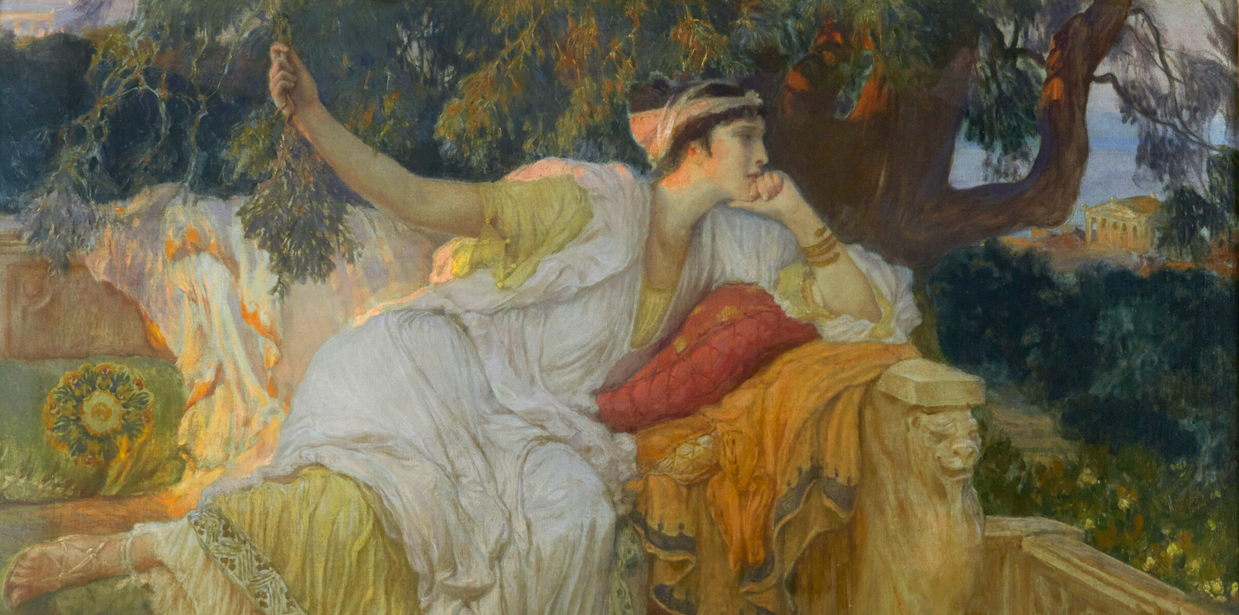 Bridgman was one of the most accomplished American painters of this genre, however, this painting is unusual in that it portrays a European subject; it was around the turn of the century that Bridgman began to experiment with neo-classical themes and thin layers of paint. Iridescent, delicate colors infuse the serene view of a young woman, draped in cascading folds of white, as she pensively stares into the distance, with the rays of the setting sun lending the entire composition a warm glow.
