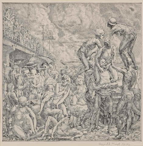 The first time Marsh traveled abroad since his infancy occurred in 1925, when the artist and his wife traveled to Europe; the artist’s French encounter with the Baroque style resulted in a definitive shift in his artistic approach. His began to crowd his compositions with figures, infusing them with a sense of chaos, mayhem, and overindulgence that added an overwhelming vitality to each individual piece. Marsh’s paintings incorporated intense, sketch-like brushstrokes, while his etchings began to demonstrate a frenzied attention to detail to physical and architectural attributes.