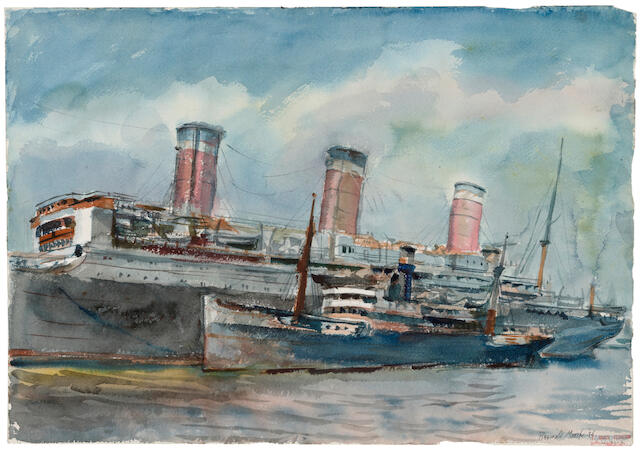 Marsh’s marriage to Betty ended in 1932, but the artist was quick to remarry one year later: Felicia Meyer, a painter fifteen years younger than Marsh, became the second wife of the artist. This occurred right around the time that the government began to revive public artwork in federal buildings, and Marsh was one of twelve artists selected for two important commissions: the first, a pair of frescoes in the US Post Office, and the second, a series of eight paintings in the New York Customs House, which portrayed an ocean liner arriving into a New York port.