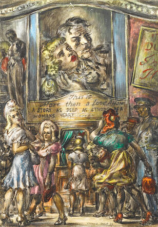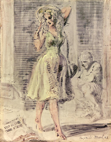 Immersing himself within the teeming life of New York City, Marsh job as a staff artist for the New York Daily News led him to explore the underbelly of society: Trolling the streets of Lower Manhattan, he gleaned inspiration from the burlesque shows along Bowery Street, storefront windows and advertisements, and the beaches of Coney Island. The defining quality of Marsh’s work was his satirical approach to portraying what would otherwise be Gotham’s most sinister subjects, and Miller encouraged the artist to focus on the buxom women of Bowery, telling Marsh, “Sex is your theme.”