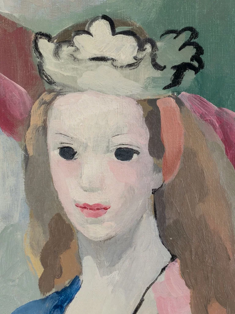 Laurencin trained in porcelain decoration before enrolling, in 1904, in painting lessons at the Académie Humbert alongside Georges Bracque. Through Bracque, she met Picasso and Guillaume Apollinaire, with whom she became romantically involved. She quickly became part of the Cubist inner circle and began to emulate their style, incorporating flatness and fragmentation into her work, as exemplified in Portrait of Clara d’Ellébeuse (1908).