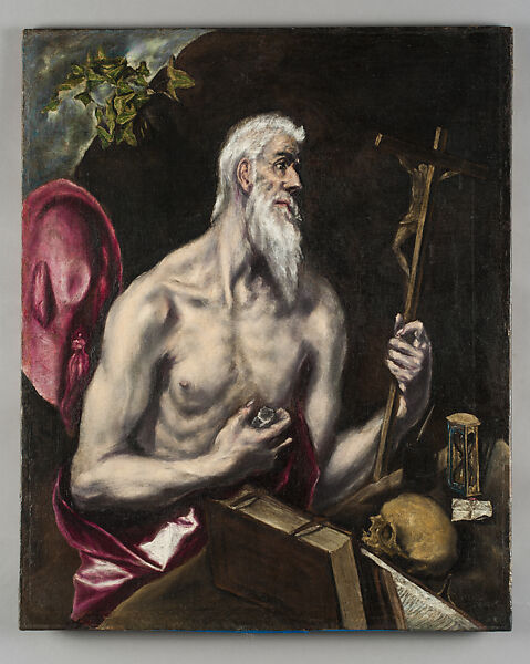 - Saint Jerome by El Greco (Doménikos Theotokópoulos), ca. 1600. This painting portrays the quintessential early Christian saint holding a crucifix, with books, a skull, and an hourglass before him—all in the artist’s recognizable Mannerist style.